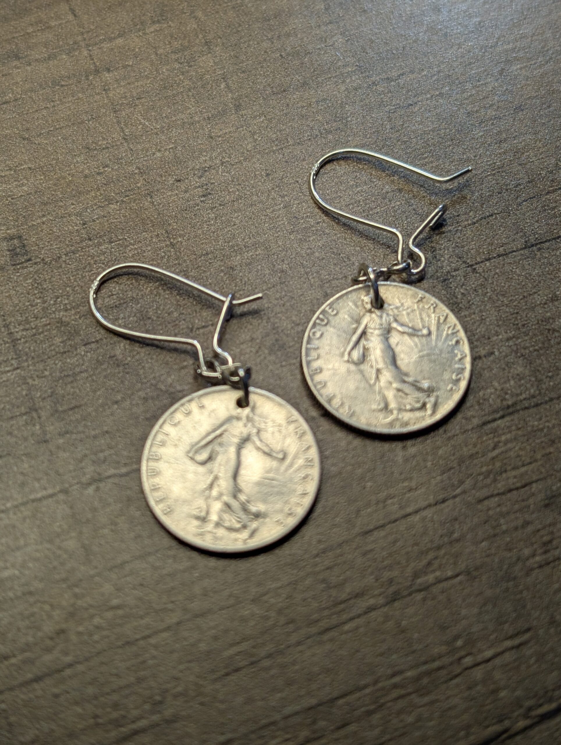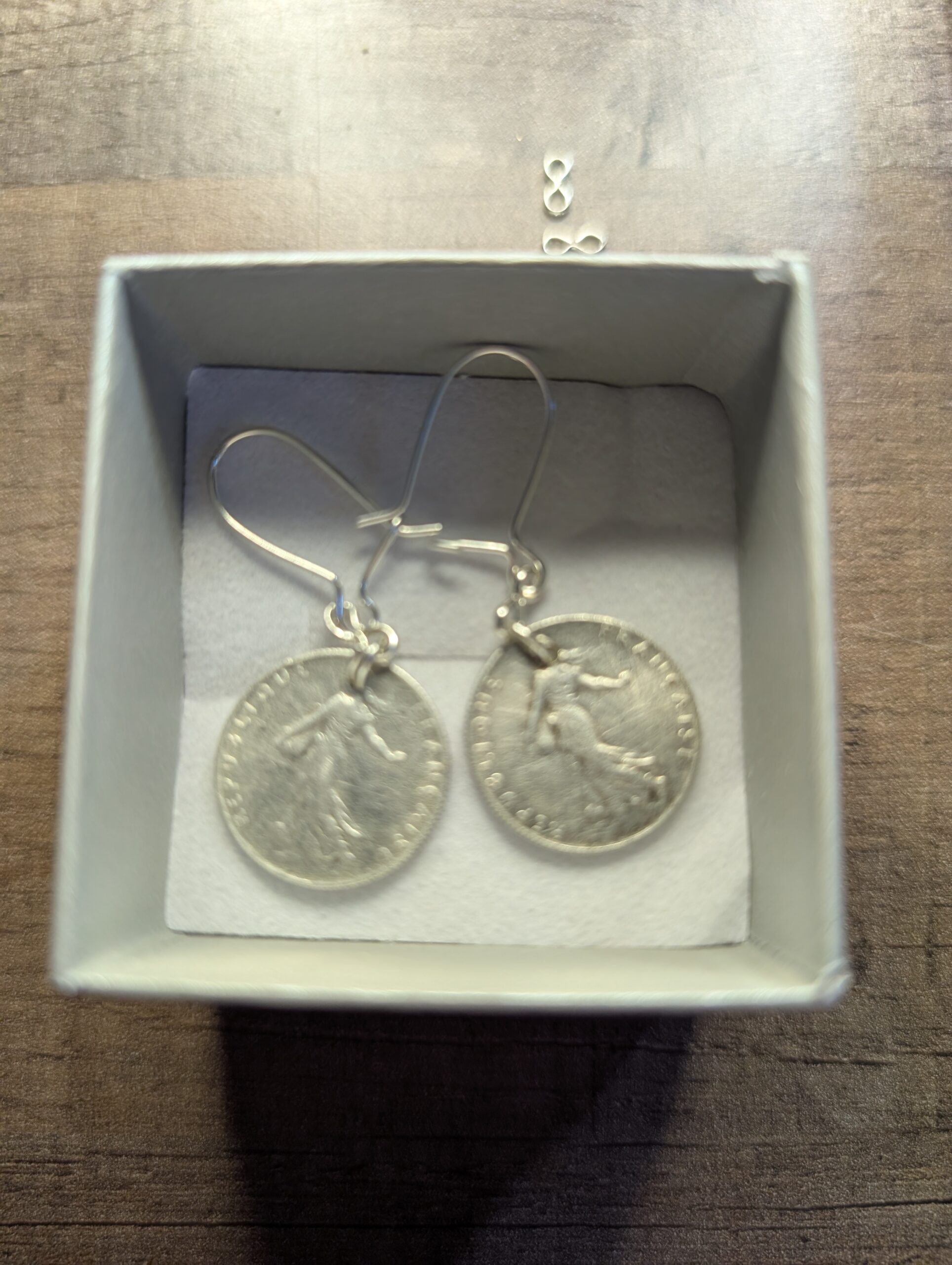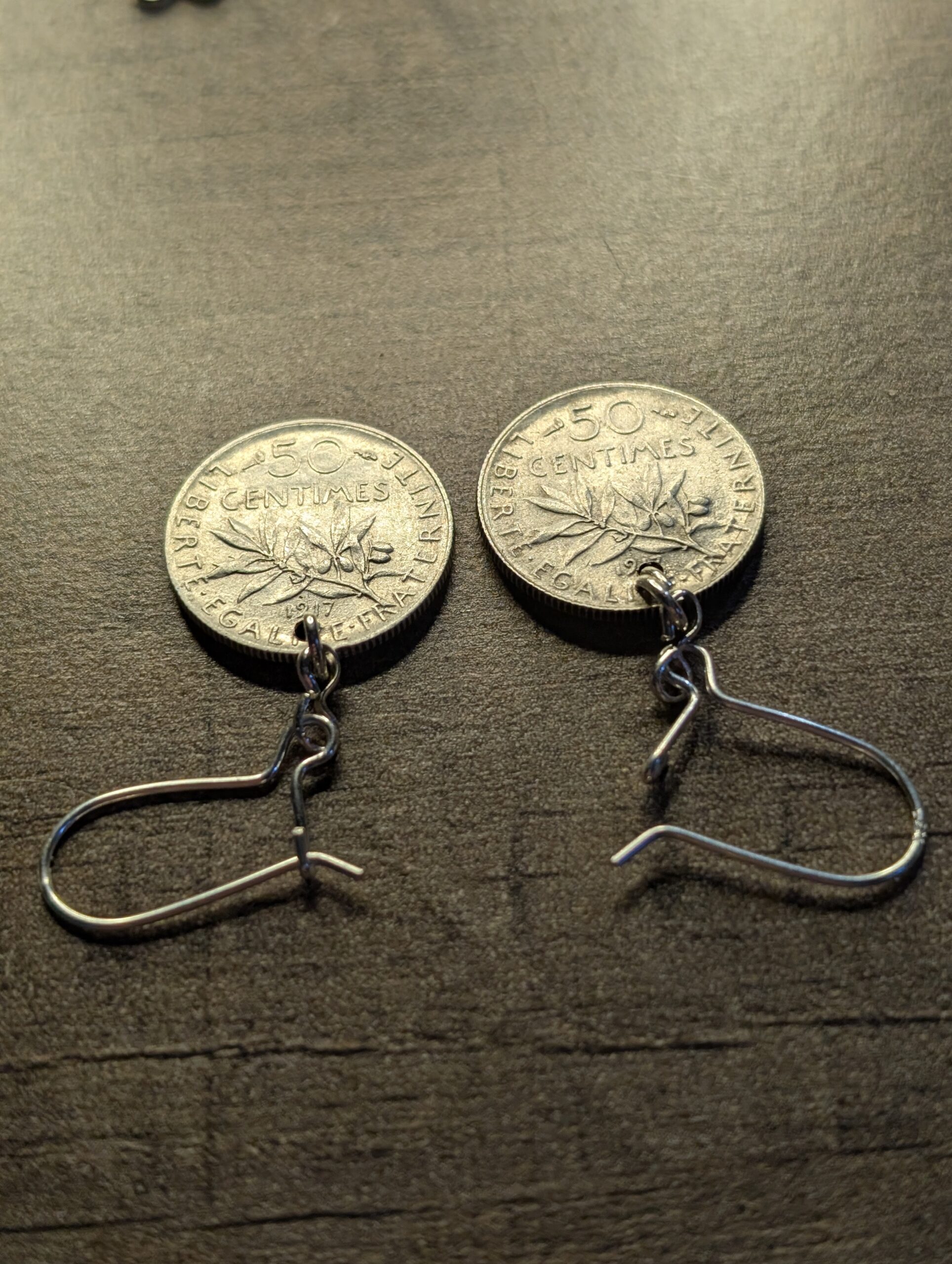 Boucles d’oreilles dormeuses en argent 925 avec pièces de 50 centimes argent des années 1900.